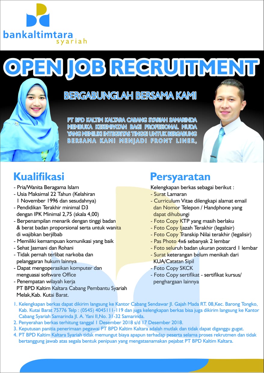 For more detail information on the requirement, please refer official source from PT BPD Kaltim Kaltara Syariah on following link below. If you match the profile and are interested in this exiting career opportunity, please send all required application documents above not later than 17 December 2018 to PT BPD Kaltim Kaltara Syariah KC Sendawar - Jl Gajah Mada RT 08 Kec Barong Tongko, Kab Kutai Barat 75776, Phone 0545-4045111-119 or send to PT BPD Kaltim Kaltara Syariah KC Samarinda - Jl A Yani II No 31-31 Samarinda. All applications are appreciated and will be treated confidentially. Only qualified, short-listed applicants will be invited for furthers process. (JobsCDC.com / Source)